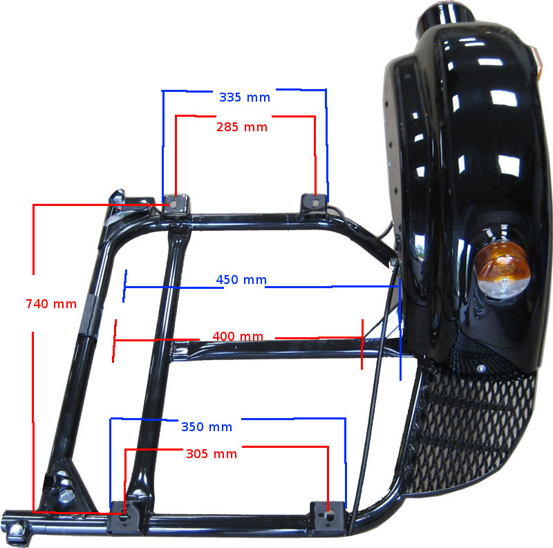 The maximum width of flat bottomed box that can be fitted to the chassis platform is 450 mm. It looks like it should be slightly more, but there are two important mounting eyelets on the motorcycle side of the chassis. If the box is shaped to avoid the eyelets it could be made wider. There are 4 built in mounting plates with 12 mm holes to take M12 bolts. The distance between the front two and the rear two is 740 mm and the distance between the left hand bolt holes and the right hand bolt holes is 290 mm.
